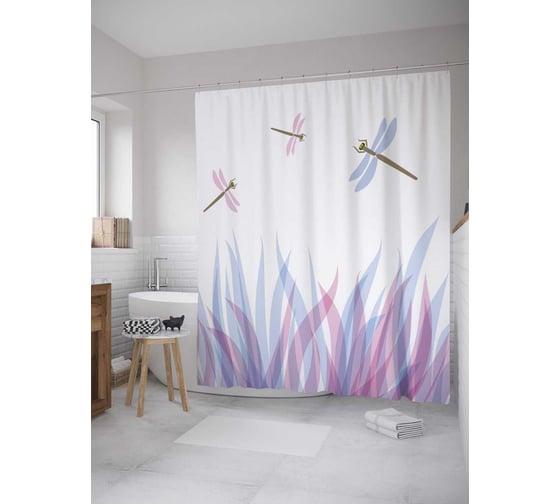 Штора (занавеска) для ванной JoyArty "Стрекозы над травой" из сатена, 180х200 см с крючками, sc_35184
