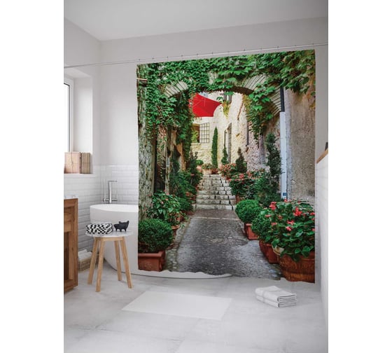 Штора (занавеска) для ванной JoyArty "Ступеньки в саду" из сатена, 180х200 см с крючками, sc_17255