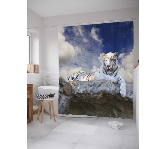 Штора (занавеска) для ванной JoyArty "Тигр на камнях" из сатена, 180х200 см с крючками, sc_38662