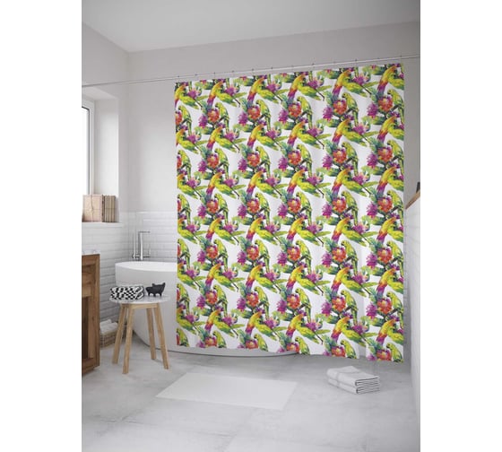 Штора (занавеска) для ванной JoyArty "Тропические птицы" из сатена, 180х200 см с крючками, sc_12038