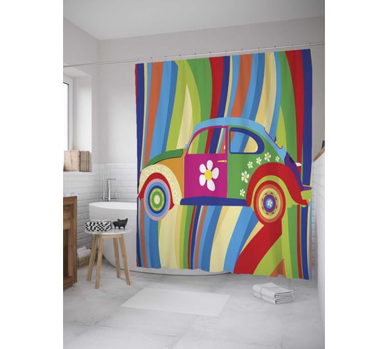 Штора (занавеска) для ванной JoyArty "Цветочная малолитражка" из сатена, 180х200 см с крючками, sc_27717