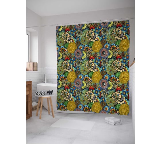 Штора (занавеска) для ванной JoyArty "Цветочный луг" из сатена, 180х200 см с крючками, sc_58426