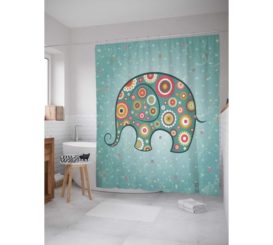 Штора (занавеска) для ванной JoyArty "Цветочный слоник" из сатена, 180х200 см с крючками, sc_27641
