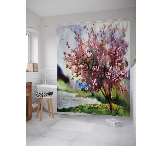 Штора (занавеска) для ванной JoyArty "Цветущее дерево у реки" из сатена, 180х200 см с крючками, sc_15097