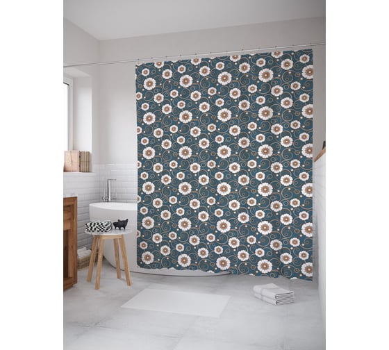 Штора (занавеска) для ванной JoyArty "Цветы с завитками" из сатена, 180х200 см с крючками, sc_54430