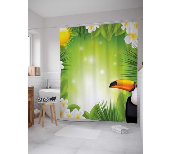 Штора (занавеска) для ванной JoyArty "Тукан и солнце" из сатена, 180х200 см с крючками, sc_18155