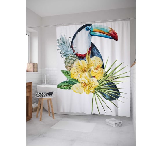 Штора (занавеска) для ванной JoyArty "Тукан с ананасом" из сатена, 180х200 см с крючками, sc_18161