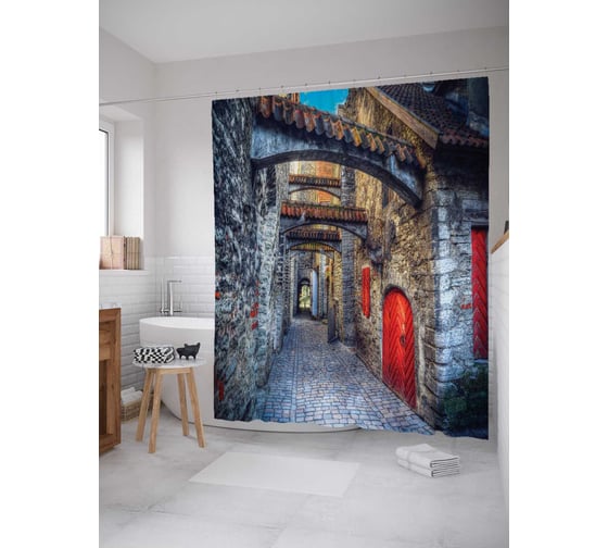 Штора (занавеска) для ванной JoyArty "Узкие каменные улицы" из сатена, 180х200 см с крючками, sc_15390
