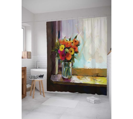 Штора (занавеска) для ванной JoyArty "Ваза цветов на подоконнике" из сатена, 180х200 см с крючками, sc_74206