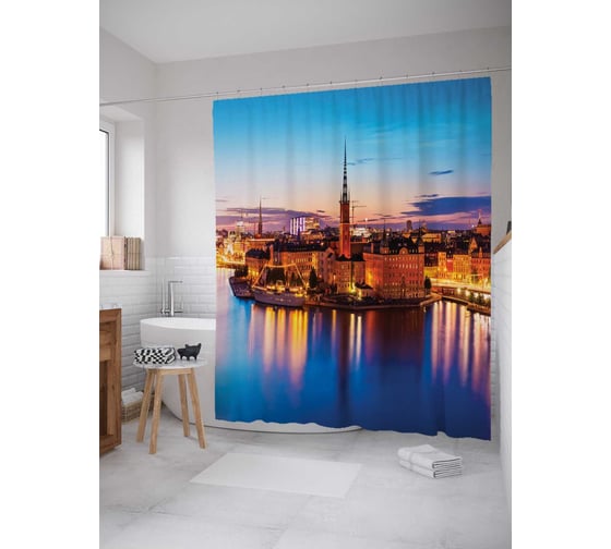 Штора (занавеска) для ванной JoyArty "Вечерний город у реки" из сатена, 180х200 см с крючками, sc_17456