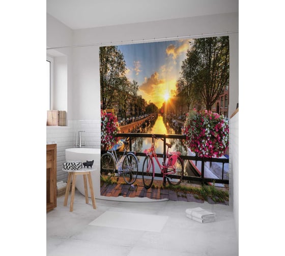 Штора (занавеска) для ванной JoyArty "Велосипеды на мосту" из сатена, 180х200 см с крючками, sc_2038