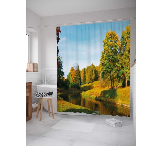 Штора (занавеска) для ванной JoyArty "Весенний лес" из сатена, 180х200 см с крючками, sc_30430