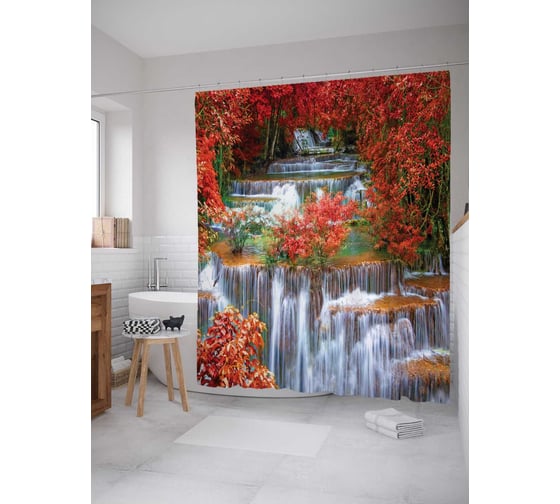 Штора (занавеска) для ванной JoyArty "Водопад в деревьях" из сатена, 180х200 см с крючками, sc_7512