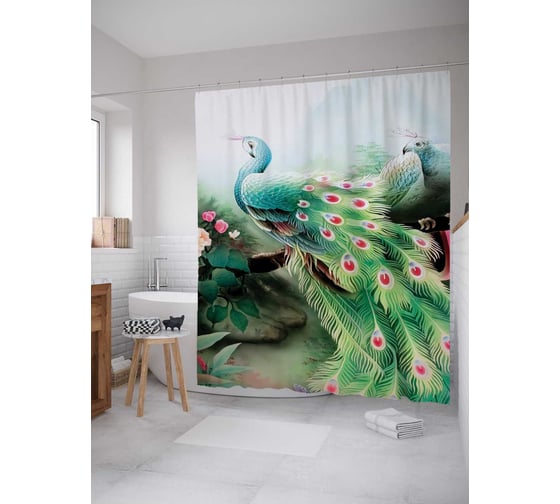 Штора (занавеска) для ванной JoyArty "Волшебный павлин" из сатена, 180х200 см с крючками, sc_16415