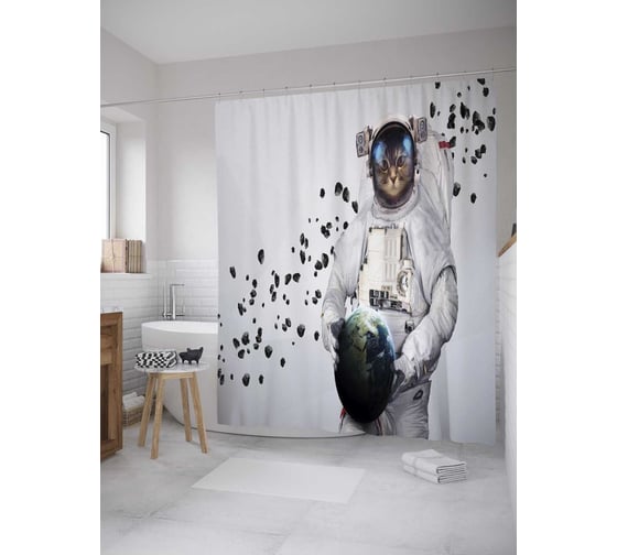 Штора (занавеска) для ванной JoyArty "Возвращение космонавта" из сатена, 180х200 см с крючками, sc_33517