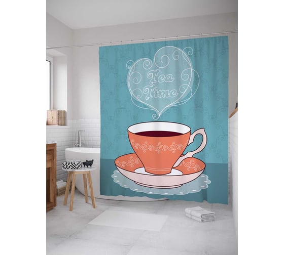 Штора (занавеска) для ванной JoyArty "Время выпить чаю" из сатена, 180х200 см с крючками, sc_73126