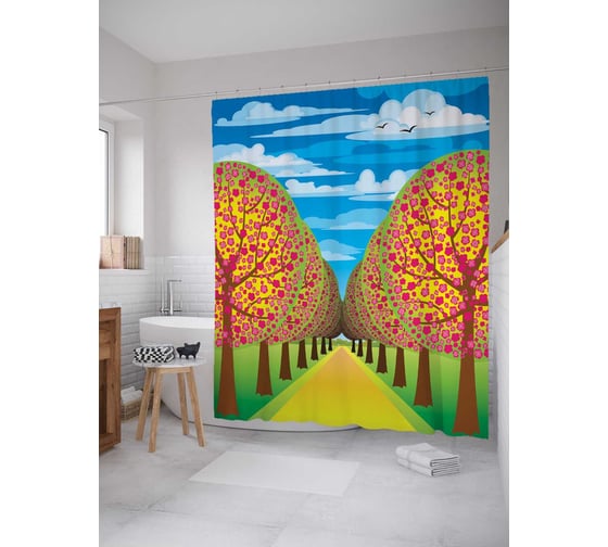 Штора (занавеска) для ванной JoyArty "Яблоневая аллея" из сатена, 180х200 см с крючками, sc_13445