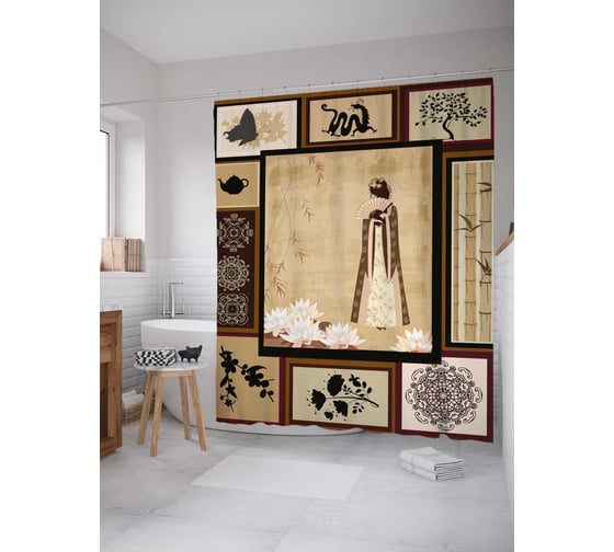 Штора (занавеска) для ванной JoyArty "Япония: Гейша среди цветов" из сатена, 180х200 см с крючками, sc_32120