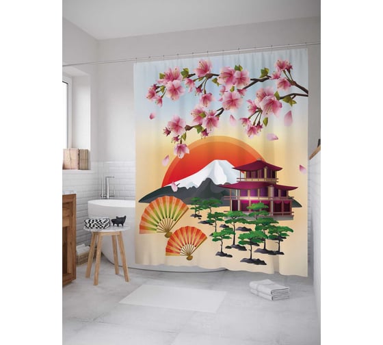 Штора (занавеска) для ванной JoyArty "Японские горы" из сатена, 180х200 см с крючками, sc_14310
