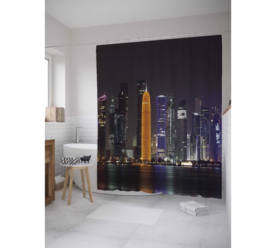 Штора (занавеска) для ванной JoyArty "Яркий небоскреб" из сатена, 180х200 см с крючками, sc_32408
