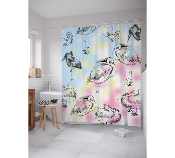 Штора (занавеска) для ванной JoyArty "Задумчивые фламинго" из сатена, 180х200 см с крючками, sc_5108