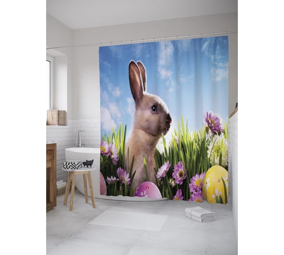 Штора (занавеска) для ванной JoyArty "Заяц и пасхальные яйца" из сатена, 180х200 см с крючками, sc_60245