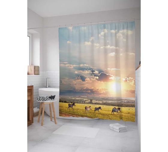 Штора (занавеска) для ванной JoyArty "Зебры на рассвете" из сатена, 180х200 см с крючками, sc_10449