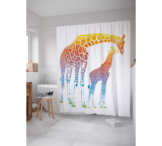 Штора (занавеска) для ванной JoyArty "Жирафы в переливах" из сатена, 180х200 см с крючками, sc_24098