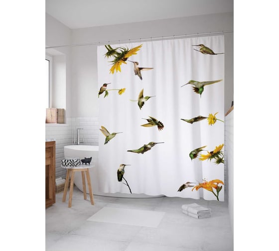 Штора (занавеска) для ванной JoyArty "Жизнь колибри" из сатена, 180х200 см с крючками, sc_12398