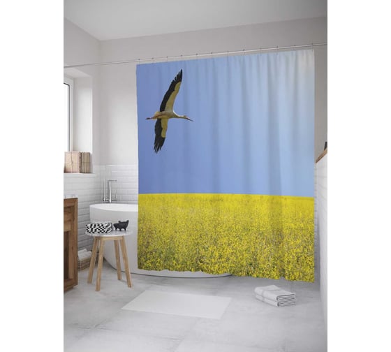Штора (занавеска) для ванной JoyArty "Журавль над полем" из сатена, 180х200 см с крючками, sc_34752