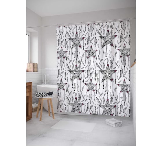Штора (занавеска) для ванной JoyArty "Звезды в перьях" из сатена, 180х200 см с крючками, sc_17940