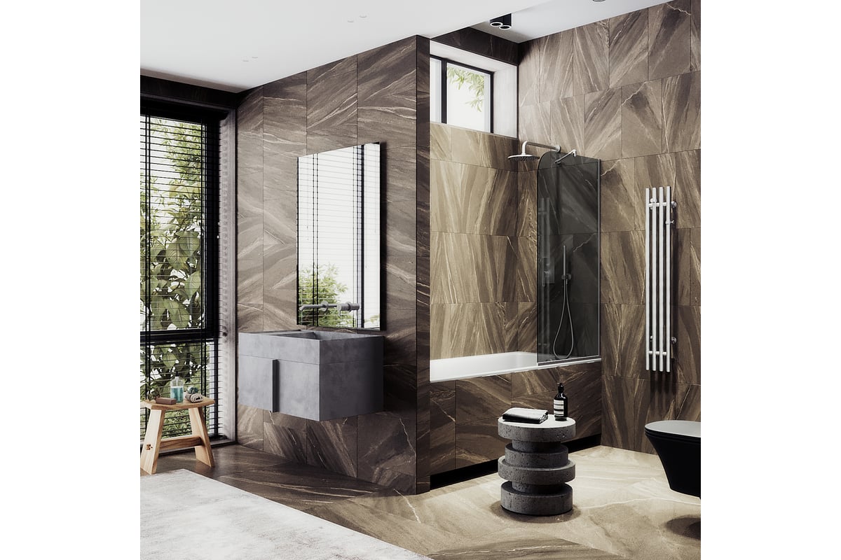Шторка выполнена из высококачественного закаленного стекла, которое не только отличается прочностью, долговечностью и устойчивостью к внешним воздействиям, но и обеспечивает надежную защиту от брызг воды.