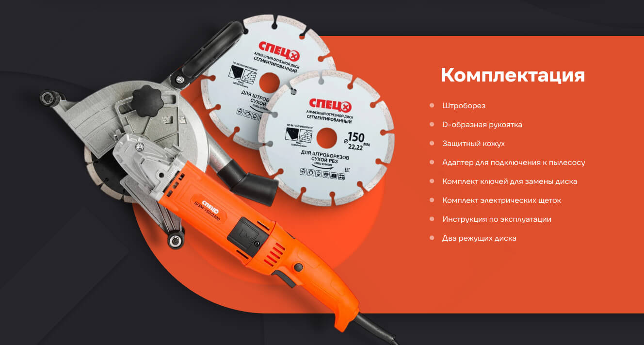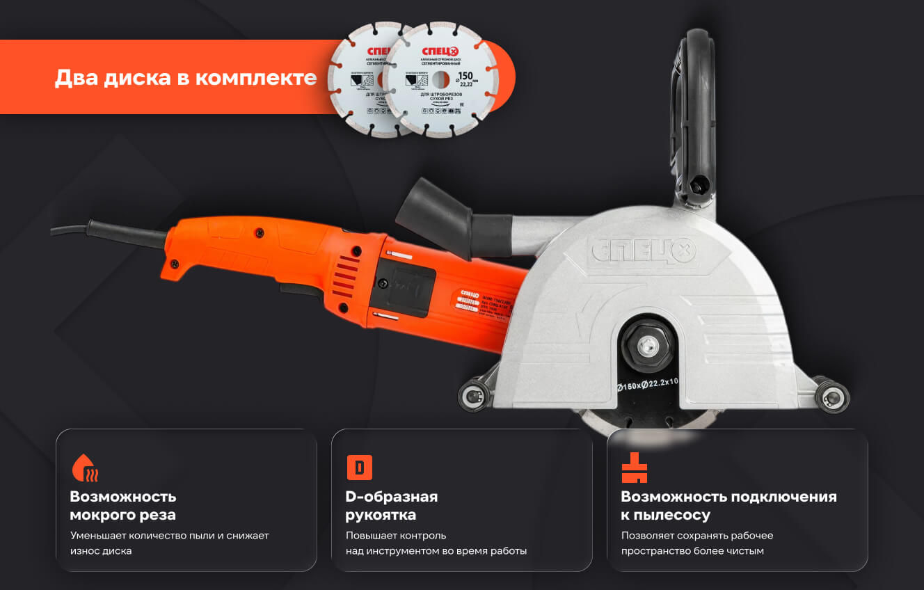 Штроборез электрический Спец ШЭМ-150/2200 2000Вт, 6500об/мин, 2 диска 150мм, штроба 40x45мм, подкл пылесоса, коробка + Диск алмазный отрезной 150*22,2*1,8мм СПЕЦ-4124/0516001