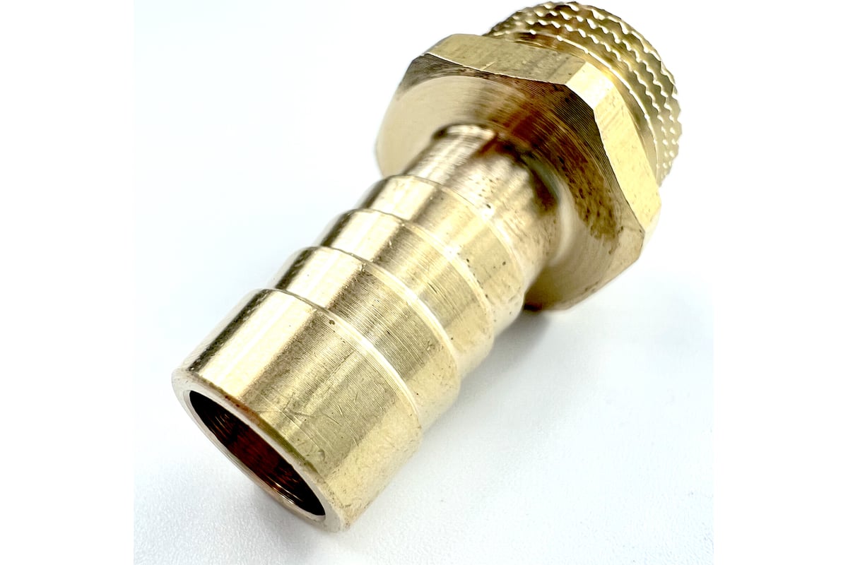 С одной стороны штуцера находится наружная резьба 1/2 дюйма, с другой стороны - выход на шланг типа "елочка" 14 мм. Для надежности соединения шланг дополнительно закрепляется хомутом подходящего диаметра (в комплект не входит).