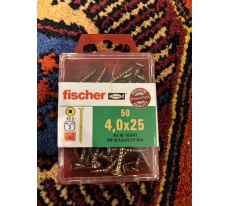 - Шуруп для дерева Fischer fpf-sz 4,0x25 yzf, жёлт. цинк, 50 шт. 653943 имеет полную резьбу, потайную головку и крестообразный шлиц. Данные параметры позволяют использовать универсальный саморез в практически любых условиях, для его установки понадобится только обыкновенная крестовая отвертка.