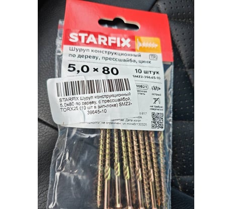 Шуруп конструкционный STARFIX 5.0x80 по дереву, с пресс-шайбой, TORX15, 10 шт. в зип-локе SMZ2-39645-10