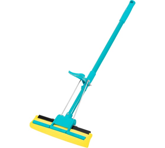 Бирюзовая отжимная швабра Palisad Home 93581 длиной 110 см, с телескопической рукояткой и полимерной губкой размером 26x5.5x6 см, используется для проведения влажной уборки.