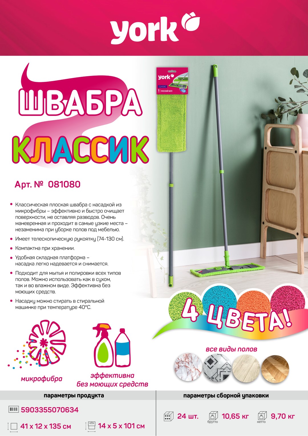 Швабра с флаундером YORK Classic 40 см, телескопический черенок 130 см, еврорезьба, МОП микрофибра 081080 подходит для очистки различных напольных поверхностей.