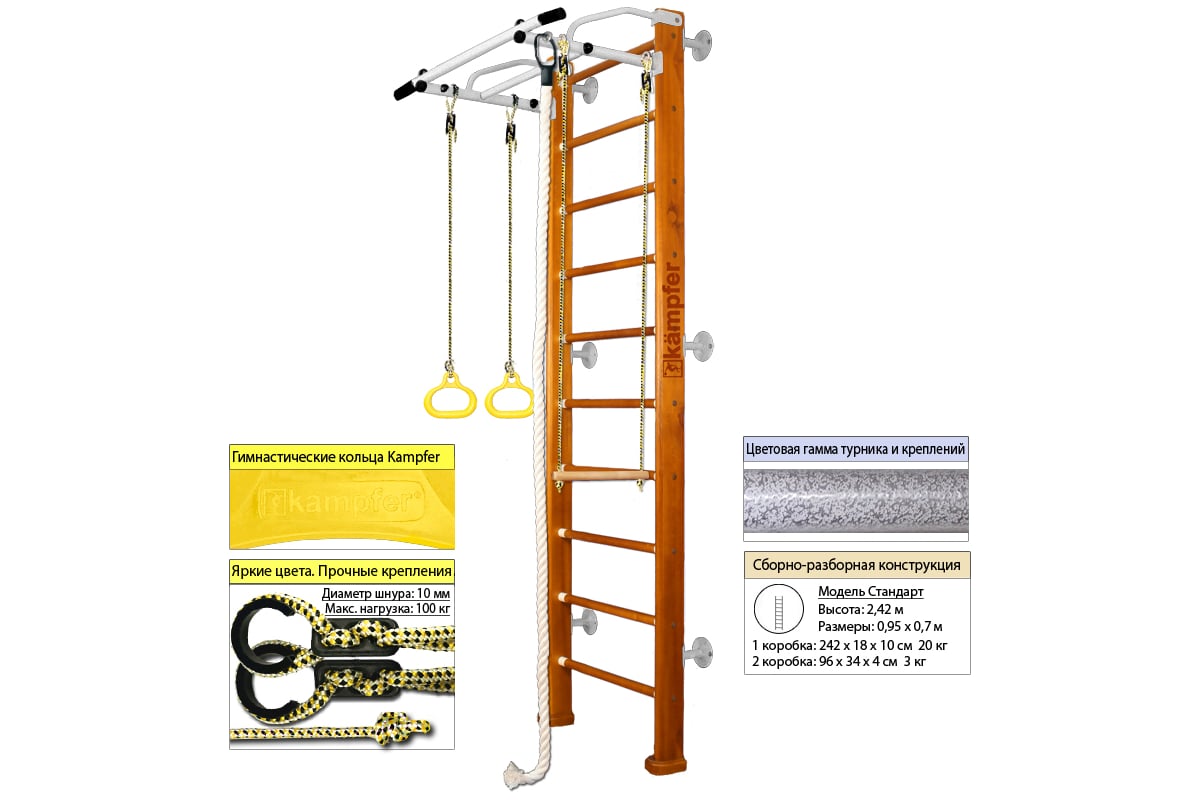 Шведская стенка Kampfer Helena Wall, №3 классический, стандарт, антик, турник K04273015 – детский спортивный комплекс, который включает в себя шведскую стенку, турник, канат, кольца и трапецию.