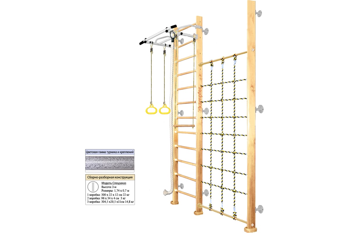 Шведская стенка Kampfer Winner Wall, №1 натуральный, высота 3м, антик, турник K03991005 – домашний спортивный комплекс, который включает в себя шведскую стенку, металлический турник, канат, кольца, трапецию и канатный лаз.