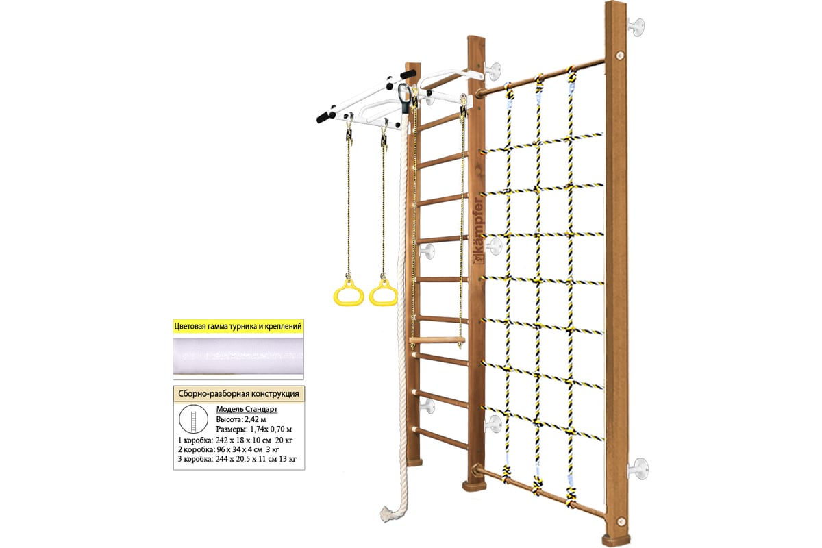 Шведская стенка Kampfer Winner Wall 55249 – домашний спортивный комплекс, который включает в себя шведскую стенку, металлический турник, канат, кольца, трапецию и канатный лаз.
