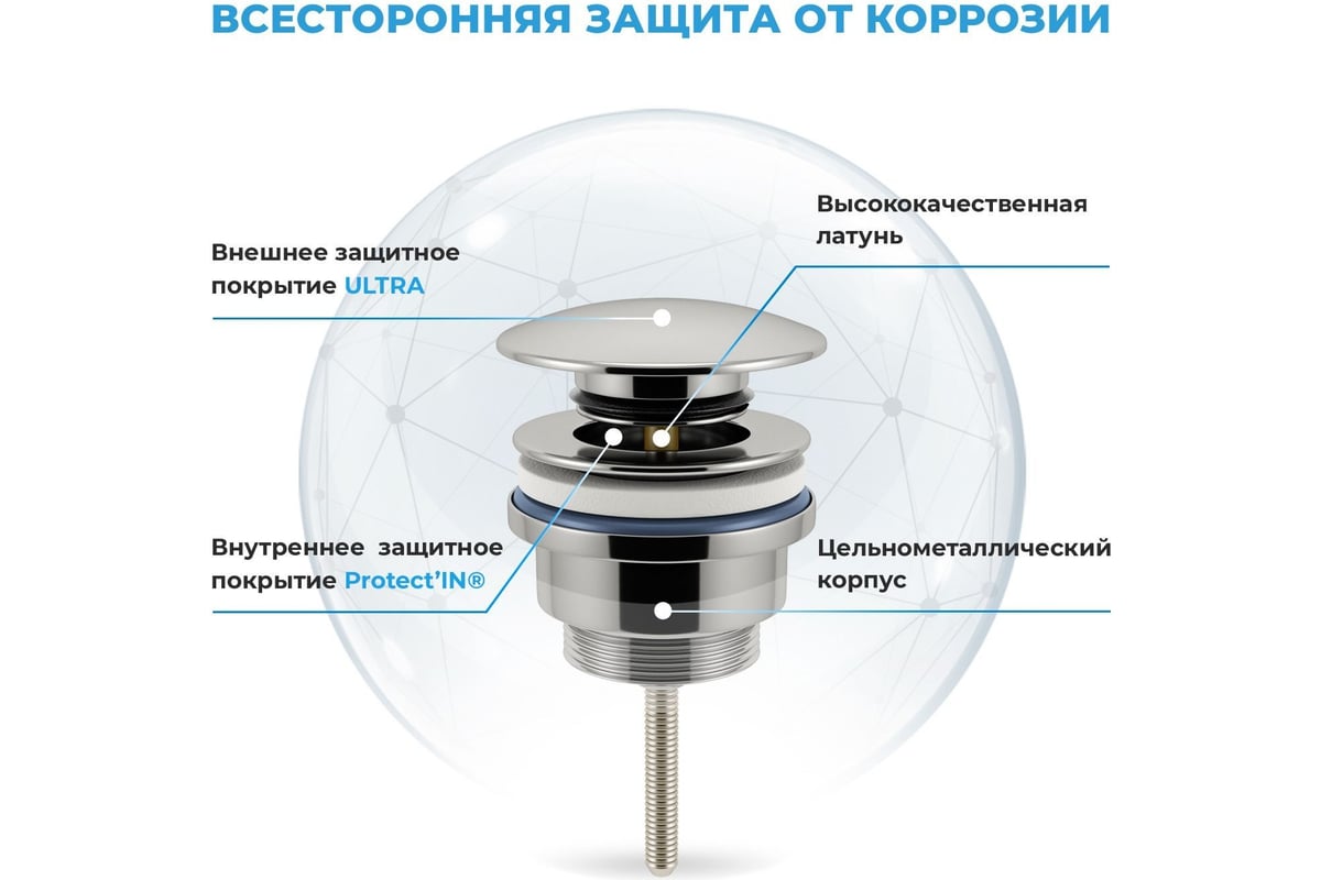 Высокая пропускная способность обеспечивает оптимальный отток воды и комфорт водных процедур. Монтаж донного клапана возможен как на умывальник с переливом, так и без переливного отверстия. Управление механизмом click-clack происходит путём нажатия на пробку водослива. Заглушка донного клапана, как и гидрозатвор сифона, препятствует проникновению неприятных запахов из канализации. Благодаря разборной конструкции прочистить колено или извлечь мелкие предметы, случайно угадившие в слив, не составит труда и займет считанные минуты.