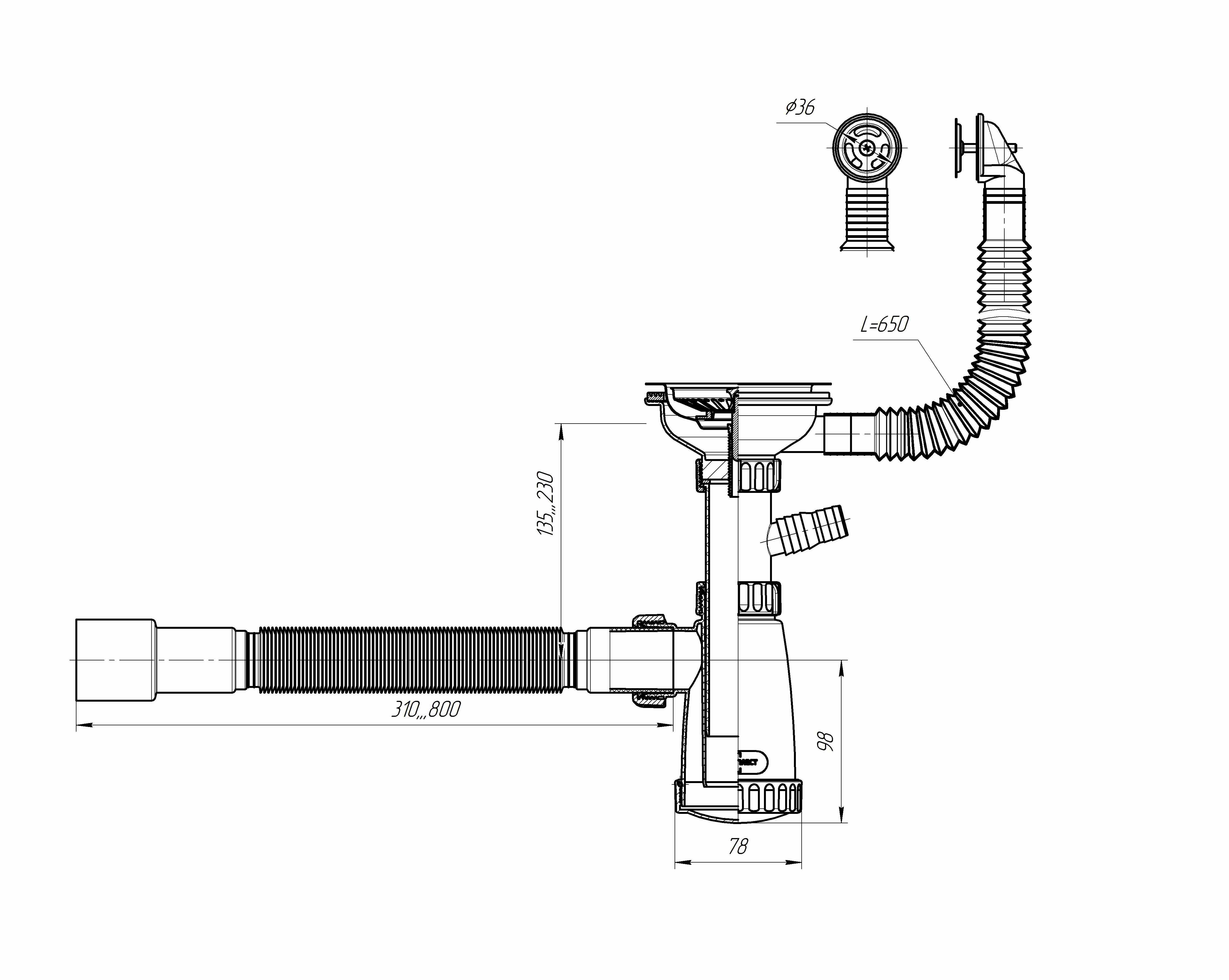- Гибкий перелив предотвращает перелив воды и легко регулируется по длине.
