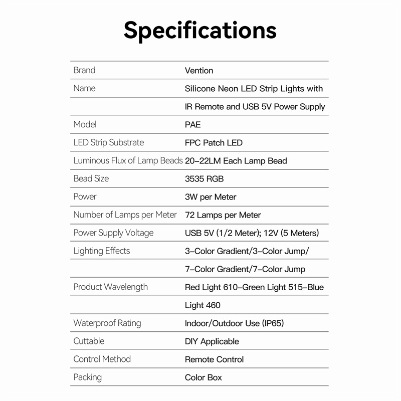 Силиконовая неоновая светодиодная лента VENTION с ИК-пультом 5V - 2м PAEWH