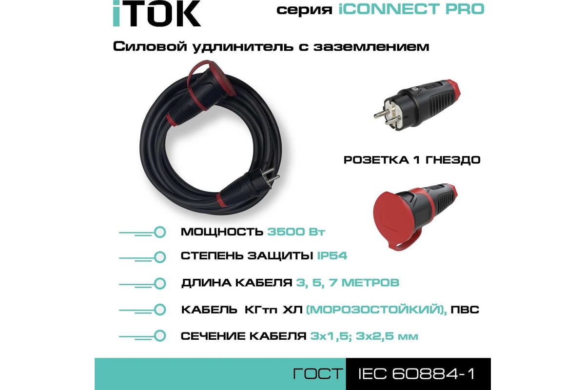 Силовой удлинитель iTOK с заземлением серии iCONNECT PRO ПВС 3x2,5 мм 1 гнездо IP54 ГОСТ 5 м i-CONNECT-PRO-SU-PVS-325-1-54-5