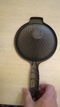 Предназначен не только для просеивания, процеживания или посыпки выпечки, но и может использоваться в качестве воронки. На стенках сита множество отверстий особой формы, через них жидкость стекает по стенкам изделия, собираясь в струю снизу, дополнительная воронка не нужна.