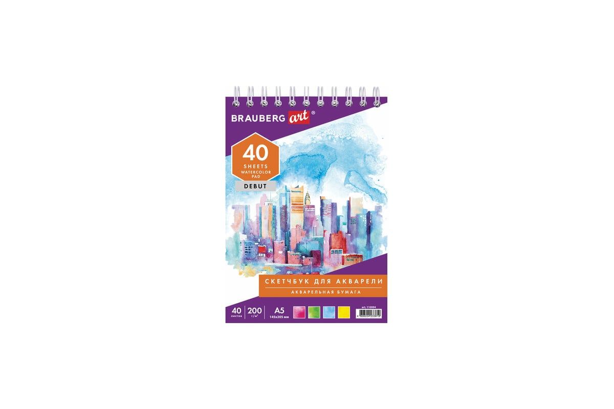 Скетчбук BRAUBERG акварельная белая бумага 200 г/м2 145х205 мм, 40 листов, гребень подложка 110994 предназначен для эскизов и графики.