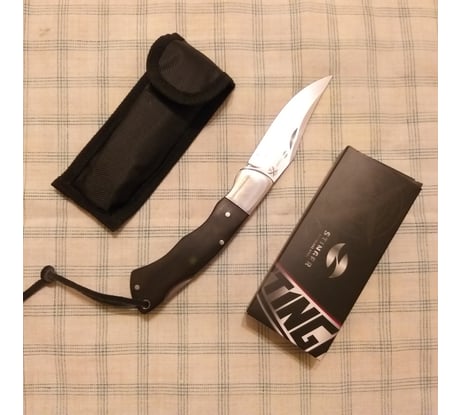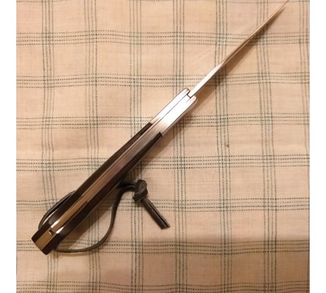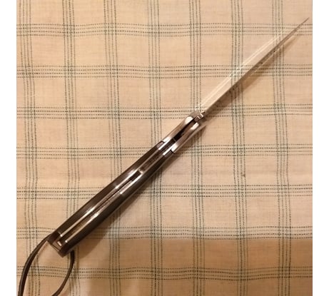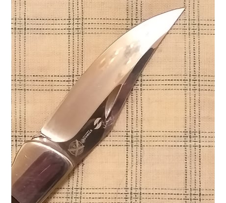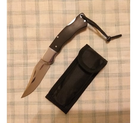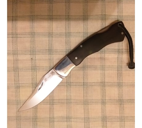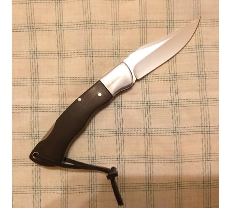 Добротно сделанный, классический складной нож, с клинком типа клип-поинт стилизованный под легендарную "лисичку". На вес достаточно тяжеловат. Видно, что он ручного изготовления, но сделан мастером своего дела и очень аккуратно! Собран вместо винтов весь на заклёпках. Накладки на рукоятках не чёрные, а тёмно-коричневые и при ярком свете видно, что они немного перламутровые. Накладки кроме того, что приклеены, дополнительно закреплены латунными заклёпками. Очень понравилось, что мастер в отверстие для темляка вставил трубку, чтобы отверстие не разболталось.