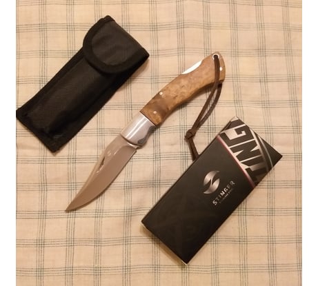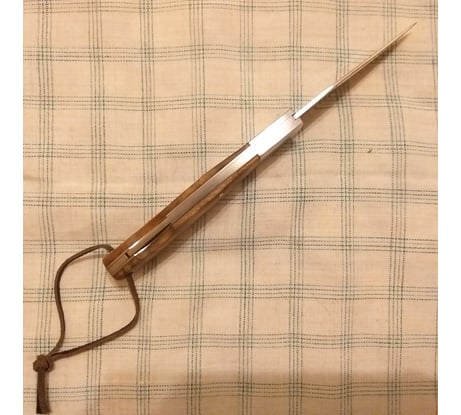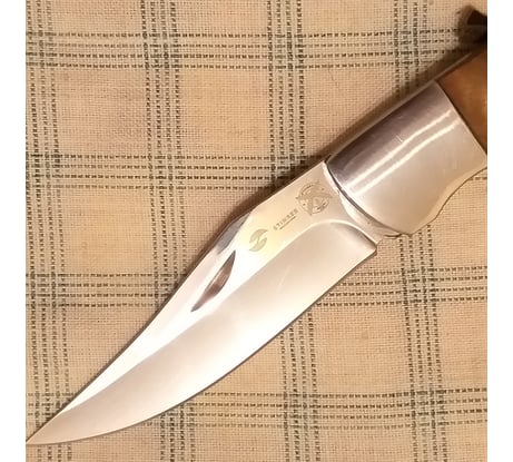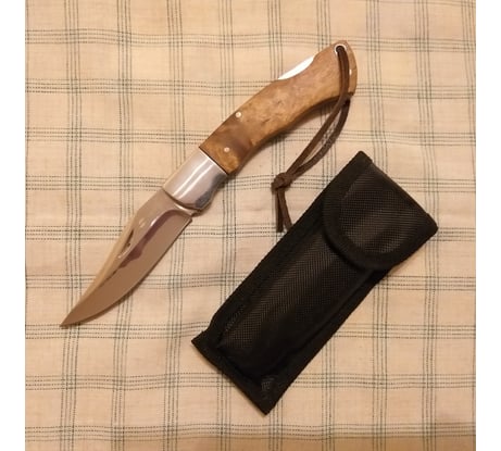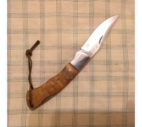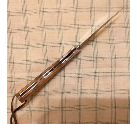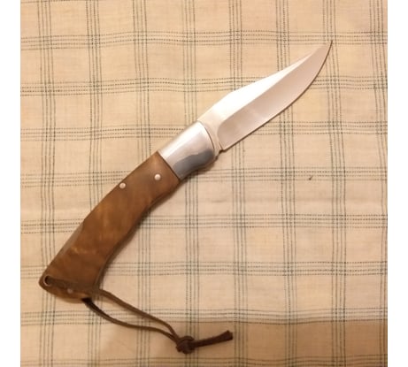 Классический складной нож, с клинком типа клип-поинт стилизованный под легендарную "лисичку". В советское время производился подпольным способом на заводах и очень ценился всеми рыбаками. Он был очень незаменим, когда надо было достать рыболовный крючок с наживкой, у случайно заглотившей его рыбы. И потрошить свежую рыбу для ухи таким ножом тоже было удобно. Нож достаточно тяжеловат. Видно, что он ручного изготовления, но сделан квалифицированными мастерами и достаточно аккуратно! Собран вместо винтов весь на заклёпках. Накладки на рукоятках светло-коричневые и при ярком свете они красиво переливаются перламутром. Накладки кроме того, что приклеены, дополнительно закреплены латунными заклёпками. Очень понравилось, что мастер в отверстие для темляка вставил трубку, чтобы отверстие не разболталось.