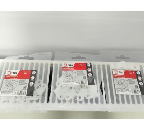 Скобы крепежные нейлоновые под винт ЭРА предназначены для фиксации отдельных кабелей, пучка проводов, гофрорукавов соответствующих диаметров. Это один из наиболее экономичных видов крепежа. Вы самостоятельно можете выбрать наиболее подходящий либо имеющийся у вас в наличии вид крепежа данной скобы к поверхности: саморез, винт с дюбелем и т. п.